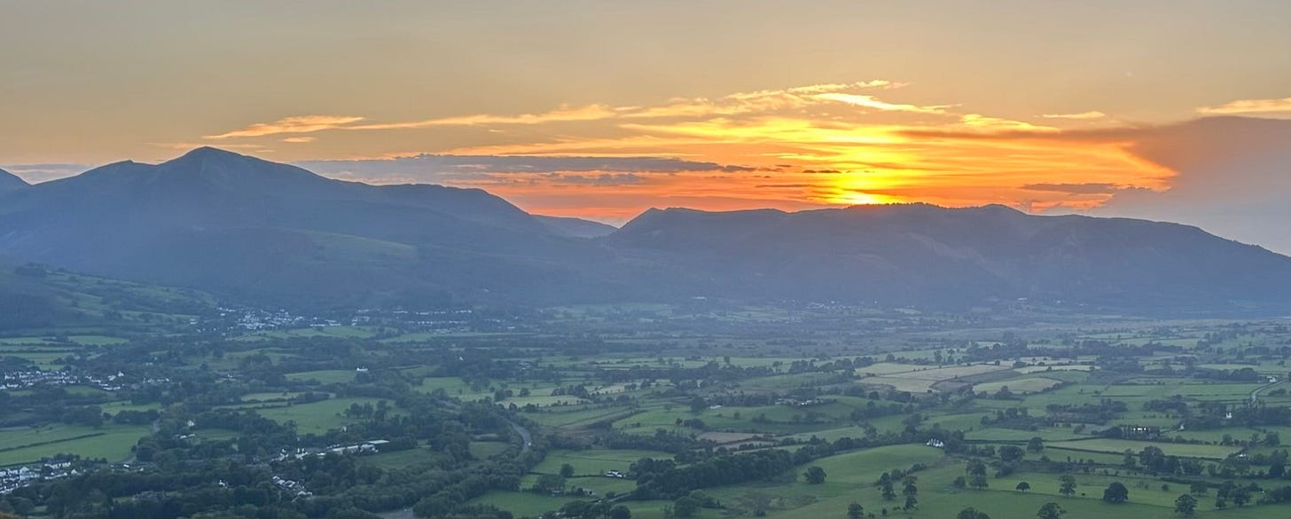 Suddenly, as the sun dropped completely behind the cloudbank, the whole sky turned the colour of burnished gold and the clouds themselves lit up as if on fire, a maelstrom of red, orange and ochre, with the occasional flash of silver. At that moment, through a gap in the clouds poured a great ray of sunshine, streaming into the valley below like a searchlight and throwing into stark relief the lines of fields, lanes and hedgerows.