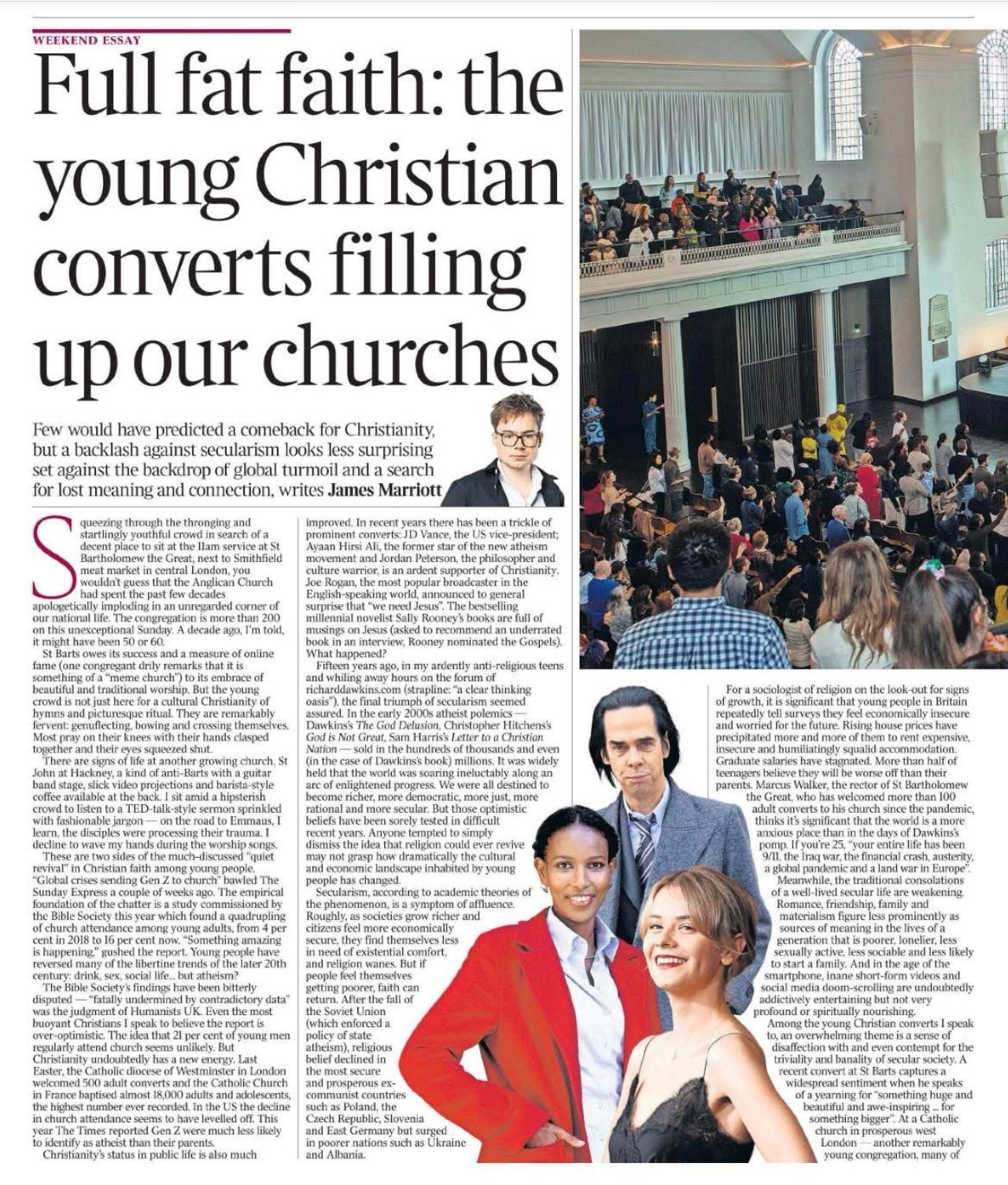 In the British newspaper The Times there is another fascinating (all the more so because the journalist is clearly a bit baffled by all this) article on the return of especially young people to churches. The “quiet revival” isn’t quite revival, let’s not get too carried away, but God is very much on the move and this story fits a pattern.