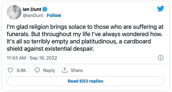 But not everybody was so impressed by that message of hope in the face of death. Whilst the funeral was still in progress, journalist and broadcaster Ian Dunt tweeted: